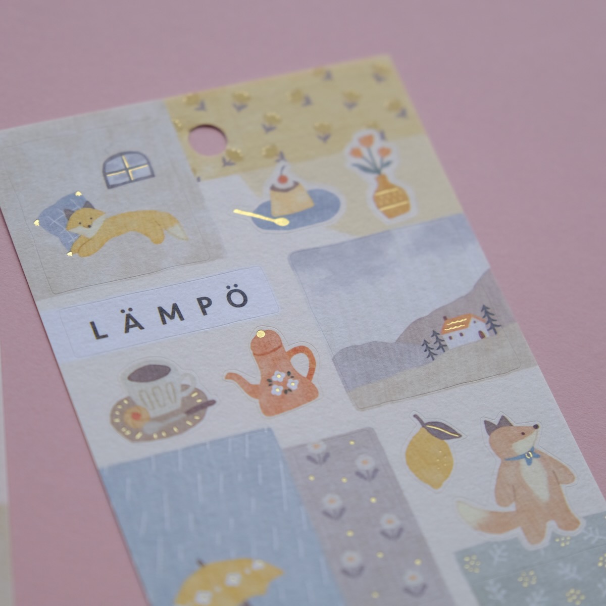 Ces stickers illustrent la journée pluvieuse d’un petit renard, composés de motifs et d’illustrations au fini mate, rehaussés de fines dorures qui renforcent l’atmosphère douce de la planche. L’idée étant de vous amuser à réaliser des collages : un petit sticker associé à un plus gros, un dessin avec un motif, etc…