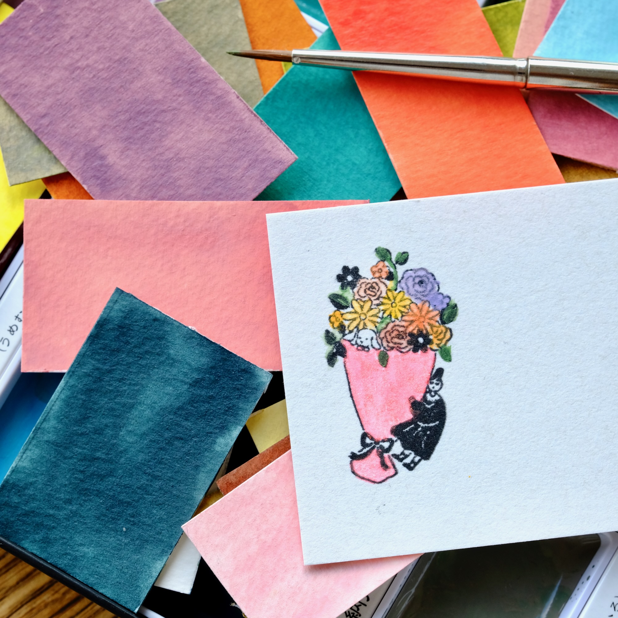 Ici, un énorme bouquet de fleurs porté par une minuscule Marle-Chan, que j’imagine ravissant, peint avec quelques touches d’aquarelle. Avez-vous spotté le petit chien qui se cache dans l’illustration ?