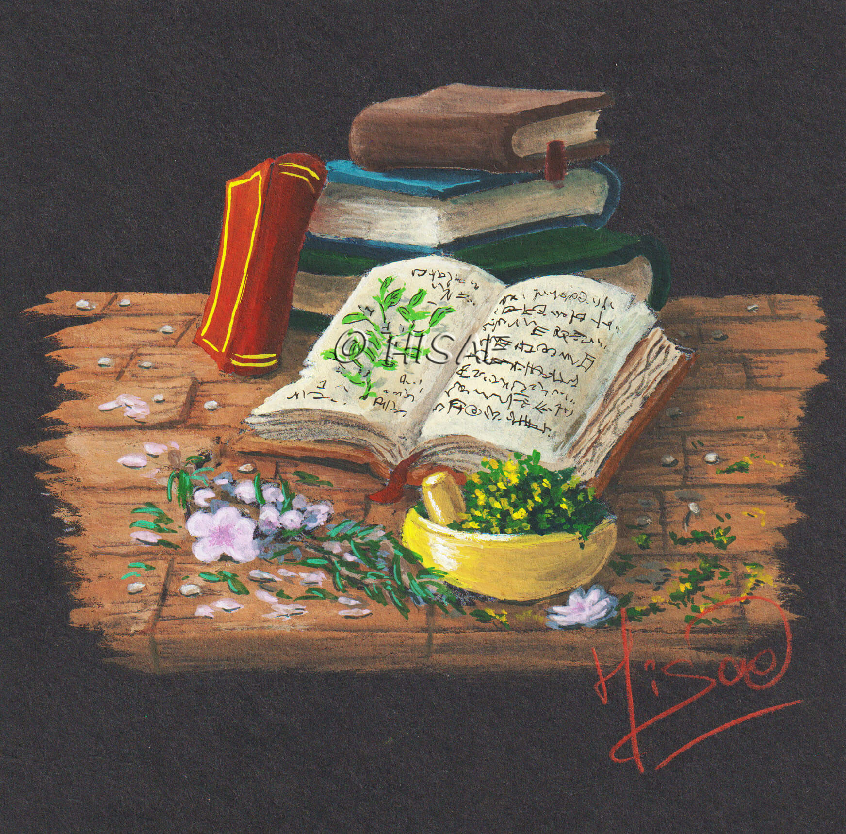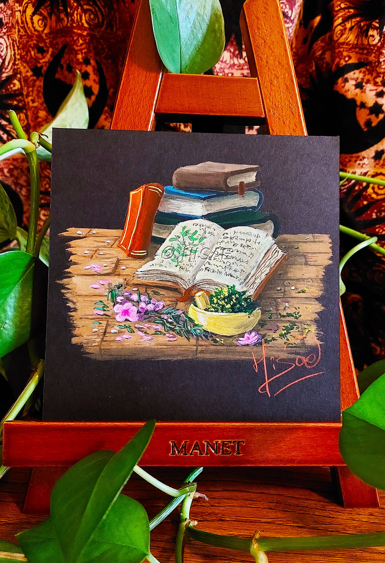 L’un des thèmes était « Herbal medicine » que j’ai transformé en laboratoire de l’herboriste avec des livres d’herbologie et des fleurs séchées qui traînent un petit peu partout. Une gouache originale en petit format pour un prix mini, idéal pour une déco mystique à moindre coût!