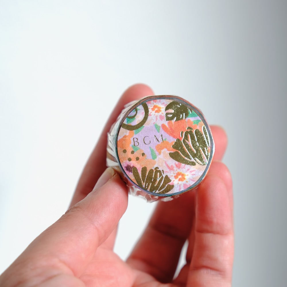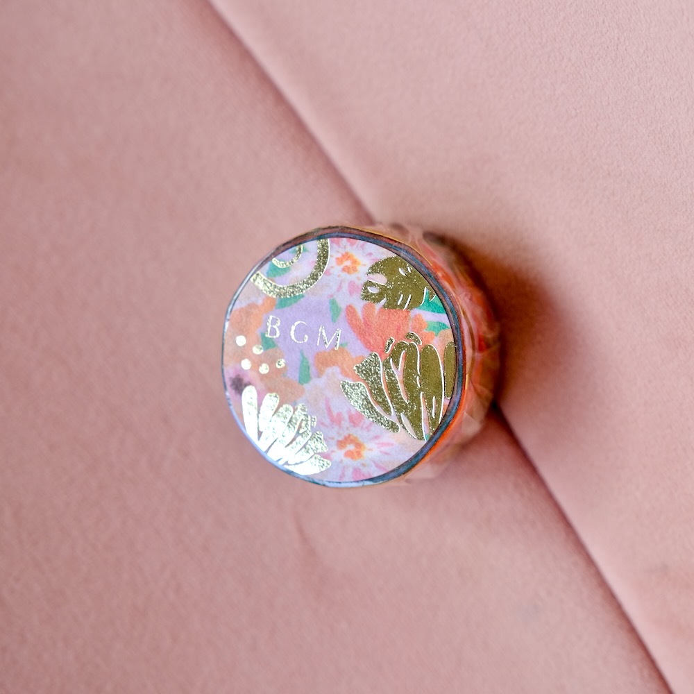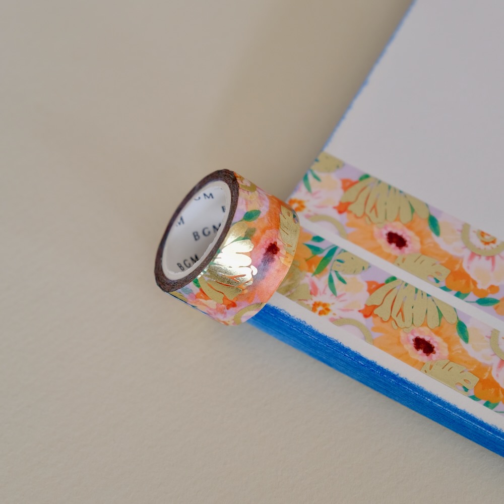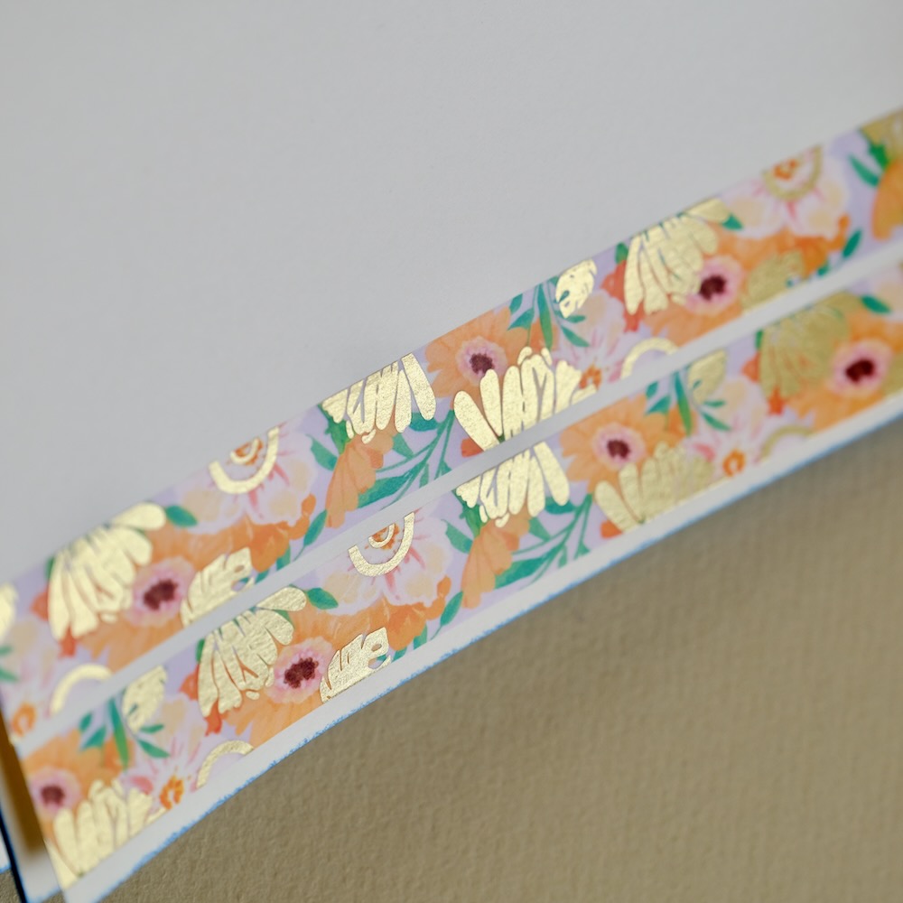 Un masking tape aux gerberas chatoyants et aux feuilles d’or pour illuminer la moindre petite chose : décorer un cadeau, ajouter une touche unique à une lettre, un agenda, un bullet journal, une enveloppe…