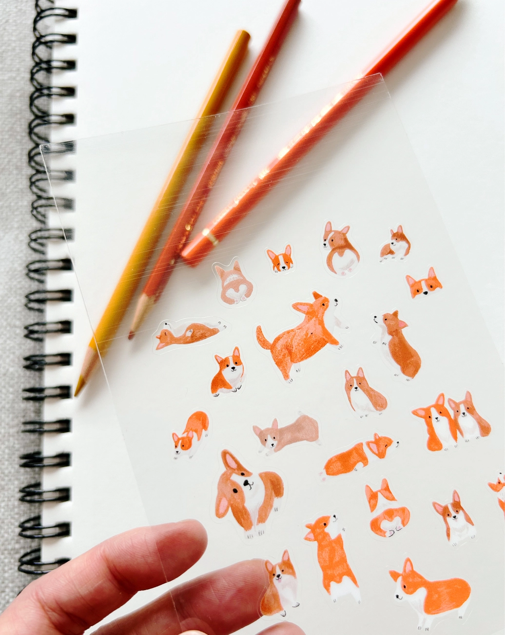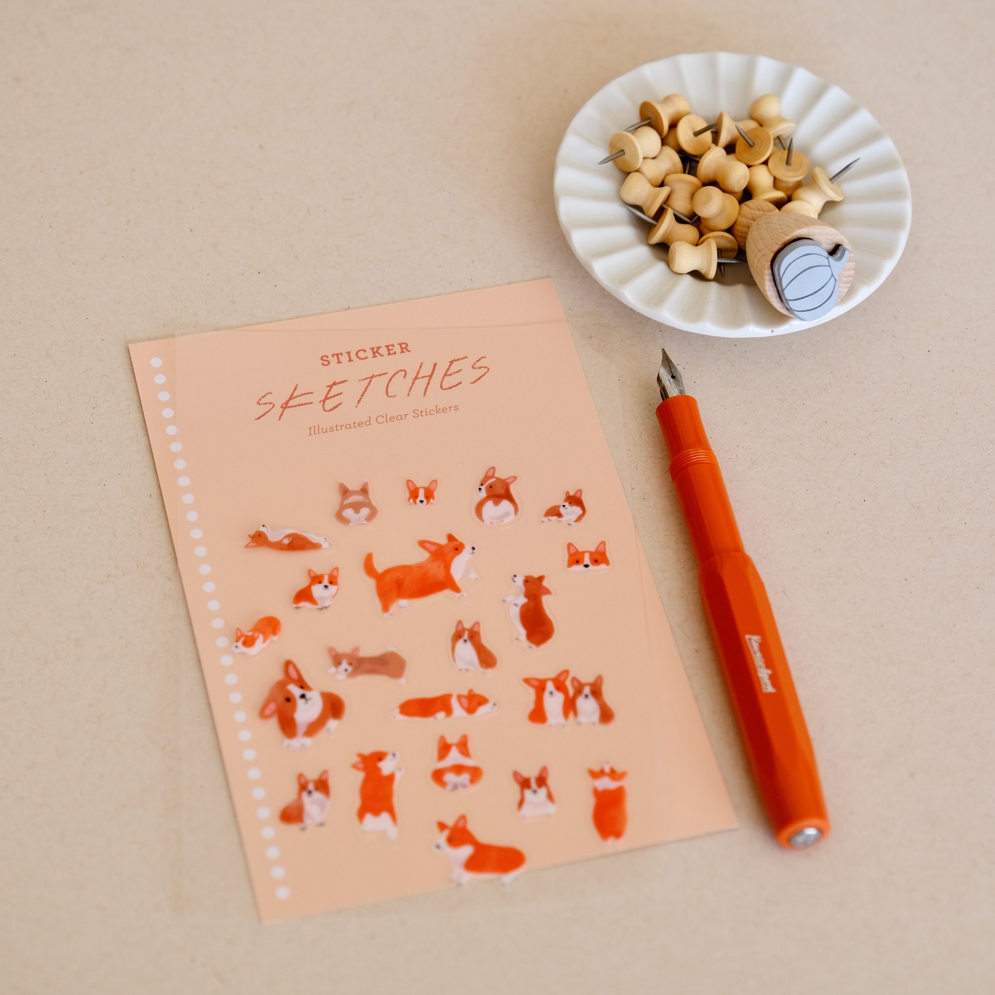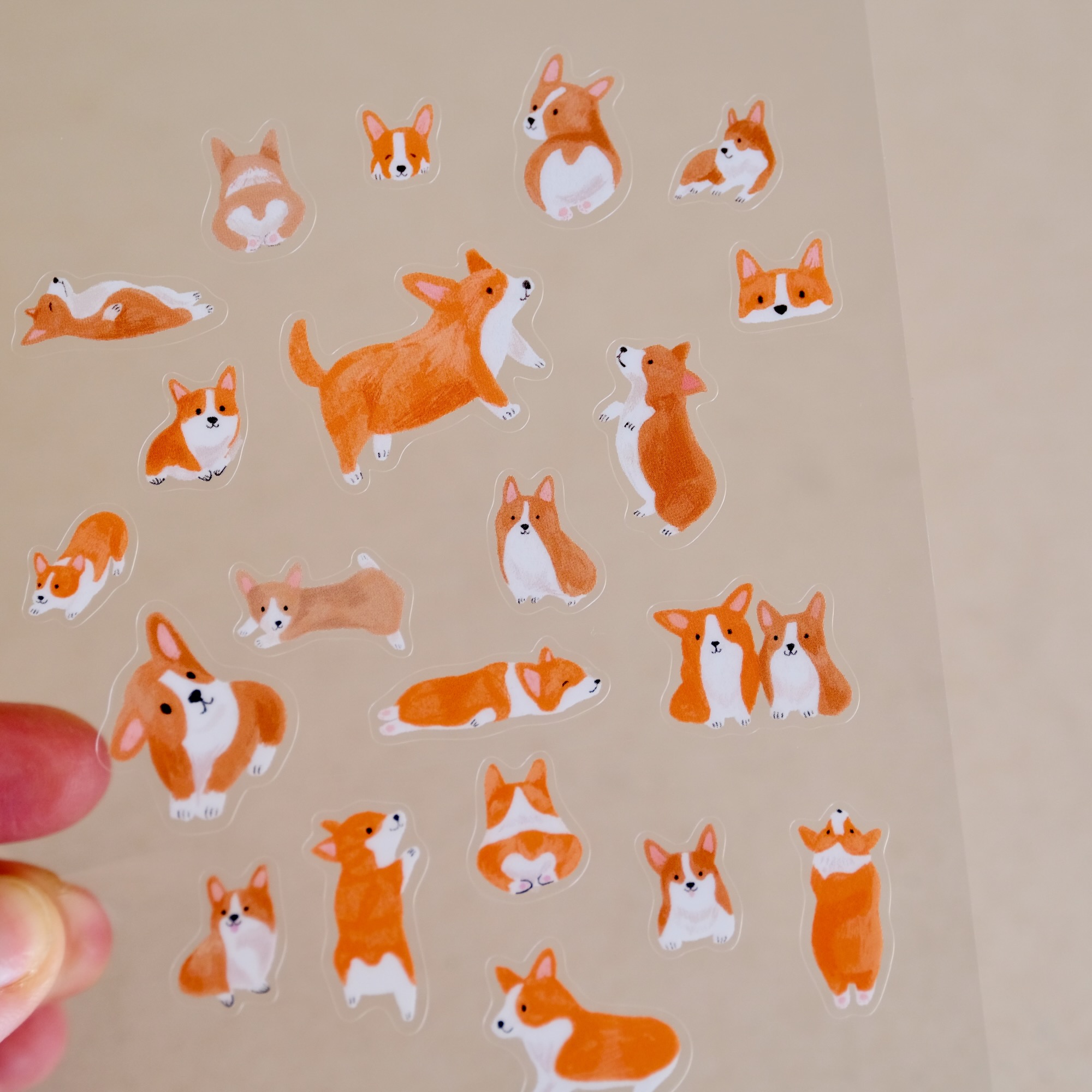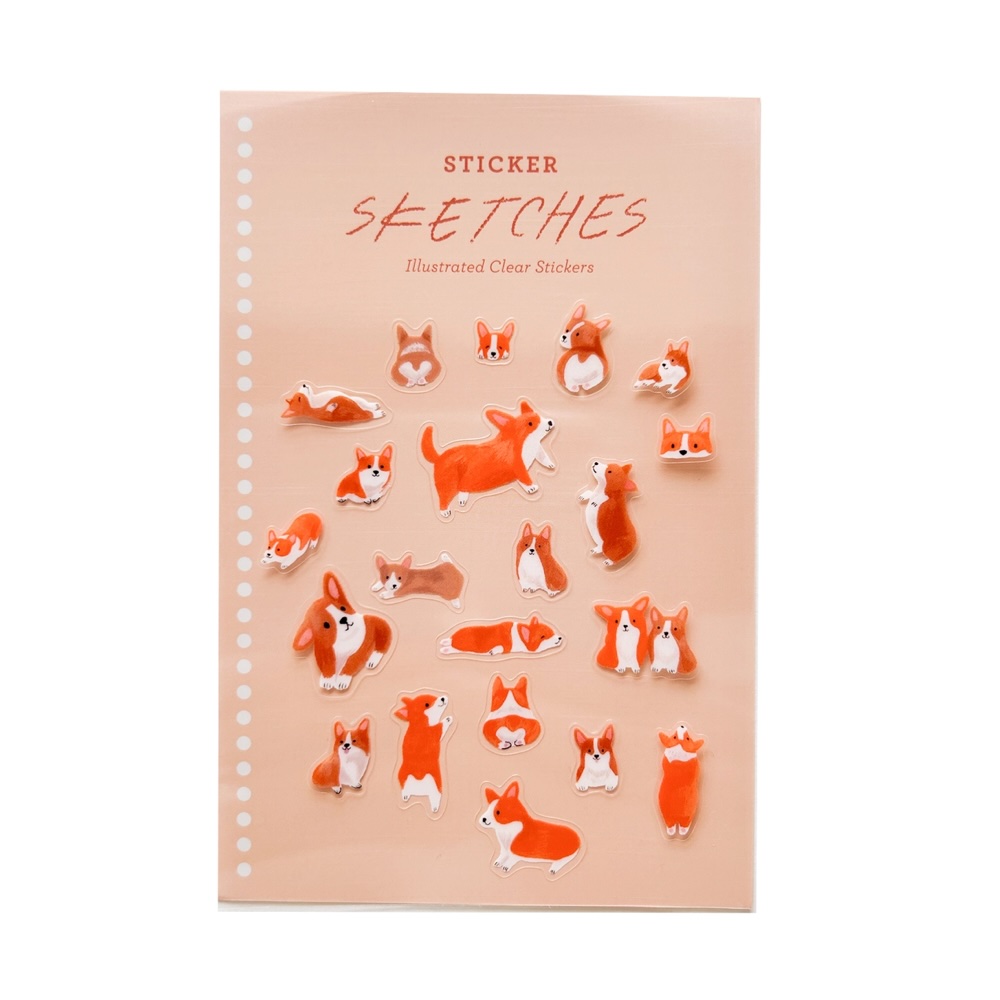 Une planche de stickers transparents ornés d’adorables corgis dans toutes les attitudes : assis, couchés, courant ou exhibant leur fameux petit derrière « cœur ». Des dessins pleins de charme qui apportent une touche joyeuse et décalée à vos carnets, lettres ou objets du quotidien, avec un joli rappel des couleurs chaudes de l’automne.