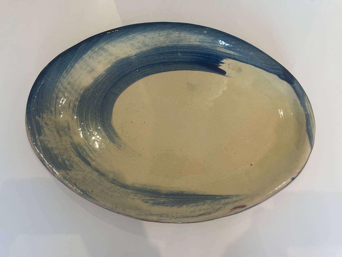 Pièce unique de forme ovale et plate fond en terre cuite vernissée réalisé entièrement à la main.