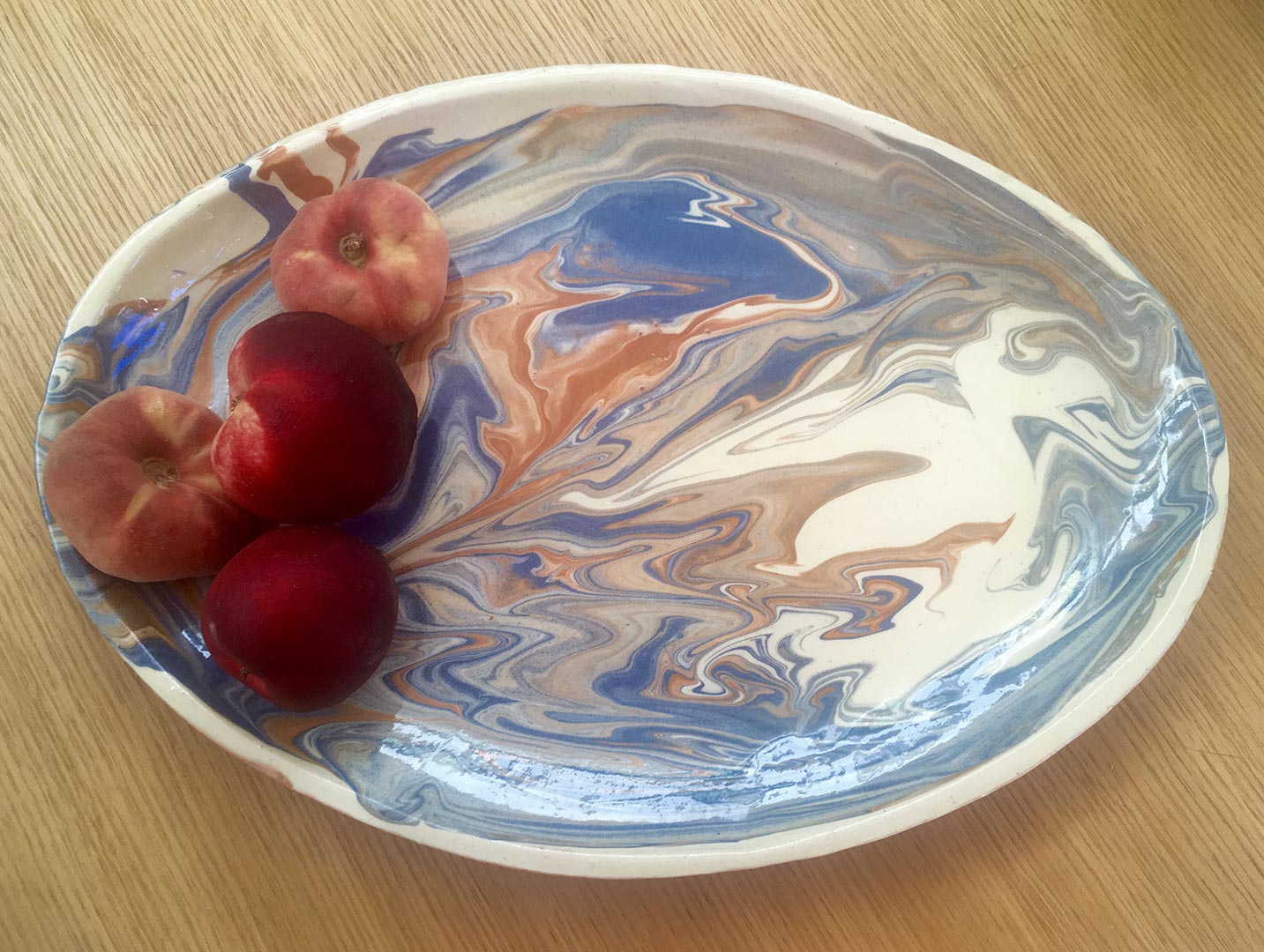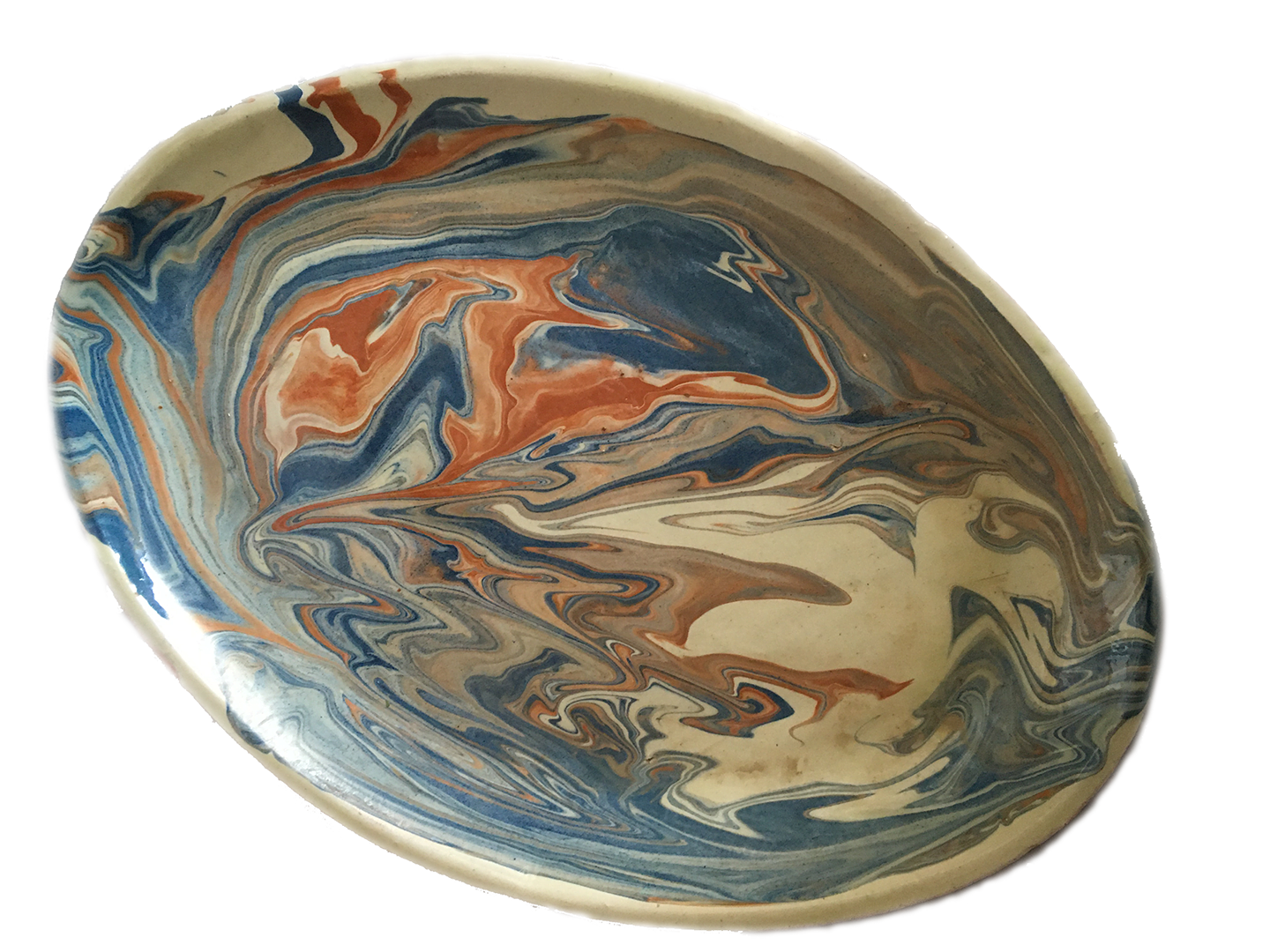 Pièce unique de forme ovale et plate fond en terre cuite vernissée réalisé entièrement à la main.