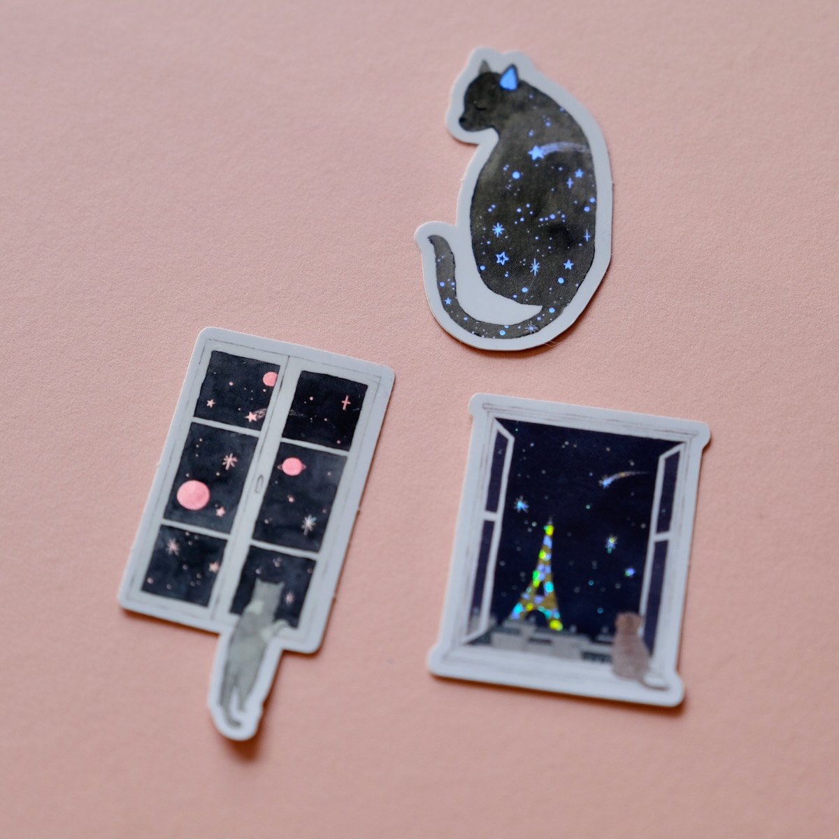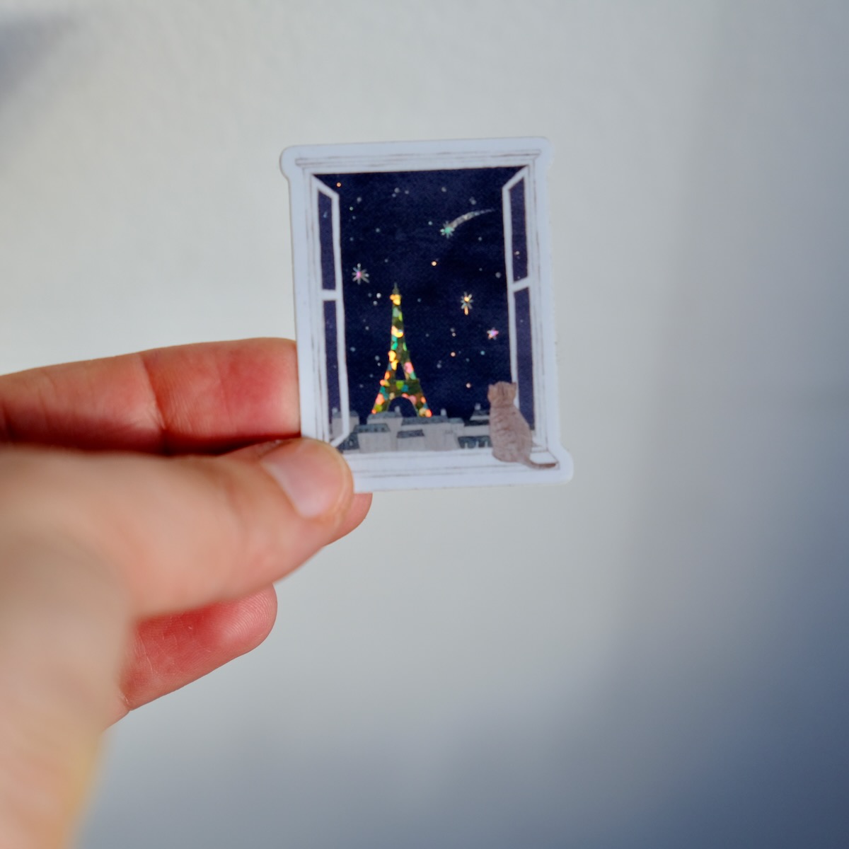 Un sticker de chat curieux qui observe la magie se tramer derrière la fenêtre. Complètement magique : en fonction de la lumière, la Tour Eiffel et les étoiles scintillent dans un miroitement aux couleurs de l’arc-en-ciel. Il apportera beauté et mystère à l’objet qu’il ornera.