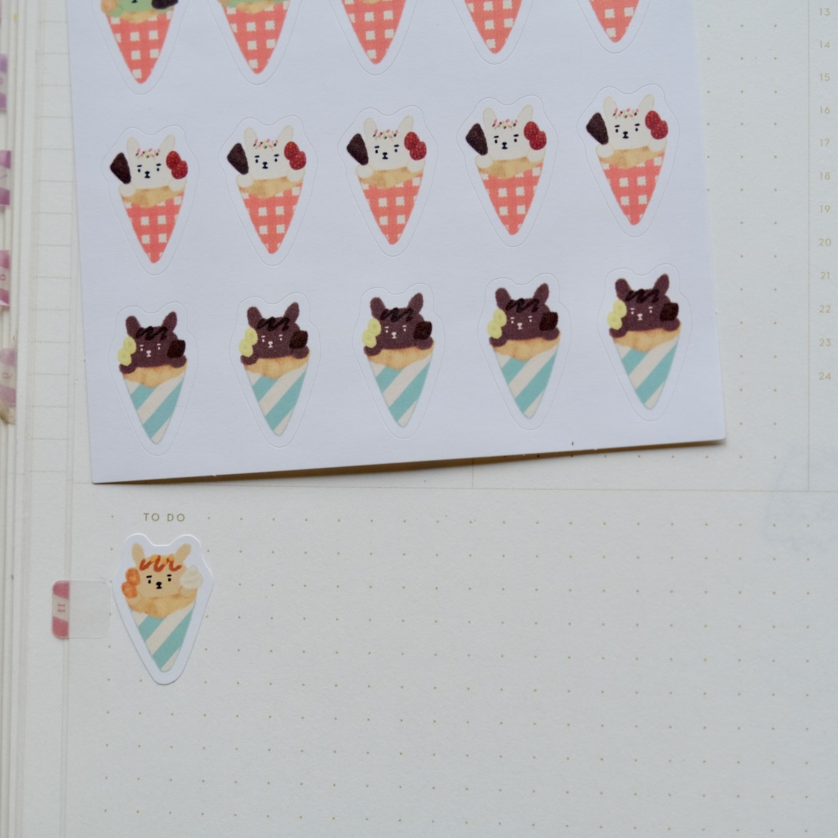 25 petits lapins-cornets de glace (caramel, fraise, pistache, vanille, chocolat) pour décorer les pages de votre agenda, marquer vos RDV, rendre le tout plus mignon et gourmand.